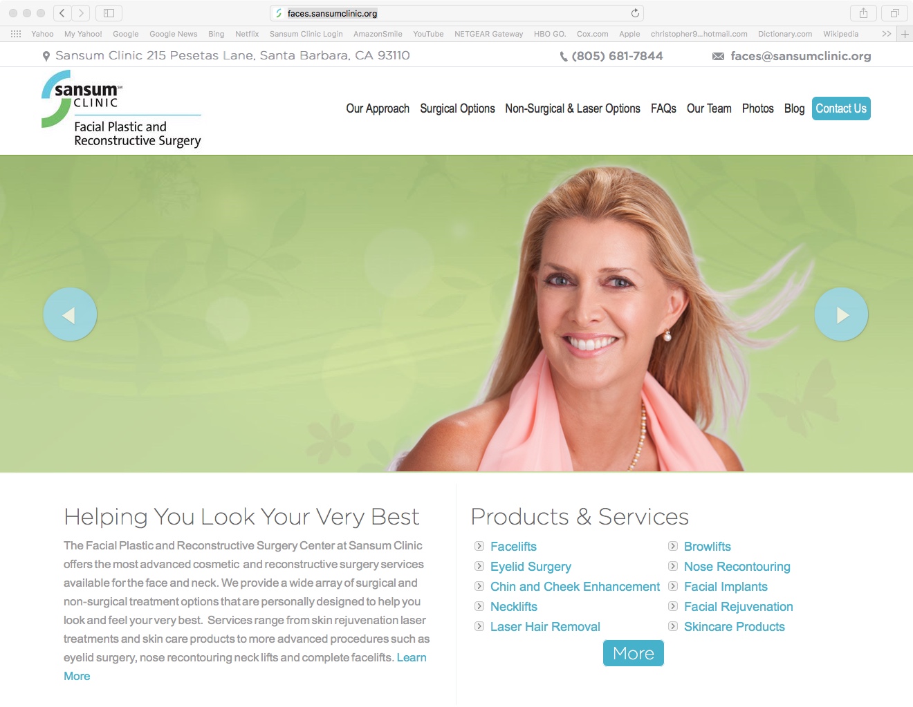 The Facial Plastic and Reconstructive Surgery Center at Sansum Clinic offers the most advanced cosmetic and reconstructive surgery services available for the face and neck. We provide a wide array of surgical and non-surgical treatment options that are personally designed to help you look and feel your very best. Services range from skin rejuvenation laser treatments and skin care products to more advanced procedures such as eyelid surgery, nose re-contouring, neck lifts and complete facelifts.